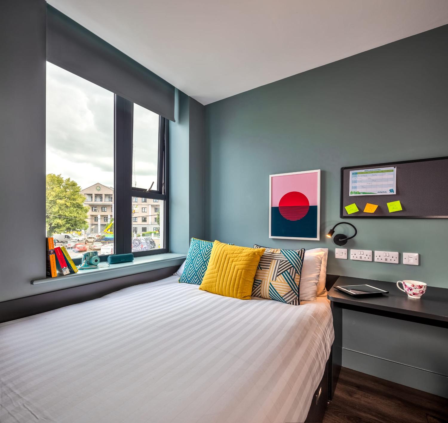 This is one of the best rooms we have on offer, with its high ceilings and huge windows we know it’ll be the right choice for you. Our Gold rooms are everything you imagined college life to be with extra space, comfy bed in your own Private Bedroom with adjoining Private Ensuite Bathroom. What more could you want? You’ll share the superb fitted kitchen and living room with other students in your apartment so you will never miss out on the fun of living with your friends!!!You’ll also have access to the free on-site Gym, free fibre broadband and to our very own on-site laundry, plus free access to the Residents Lounge and Deck.This is a modern single-occupancy en-suite bedroom with:Rooms range in size from 11 m2Room contains compact double bed (1,400mm x 1,900mm)Private bathroom.Fully furnished bedroom to include wardrobe, shelving, study desk with integrated pinboards, study chair, desk lamp, full length mirror and plenty of smart storage.Fully equipped living room and kitchen / dining area shared with other people.